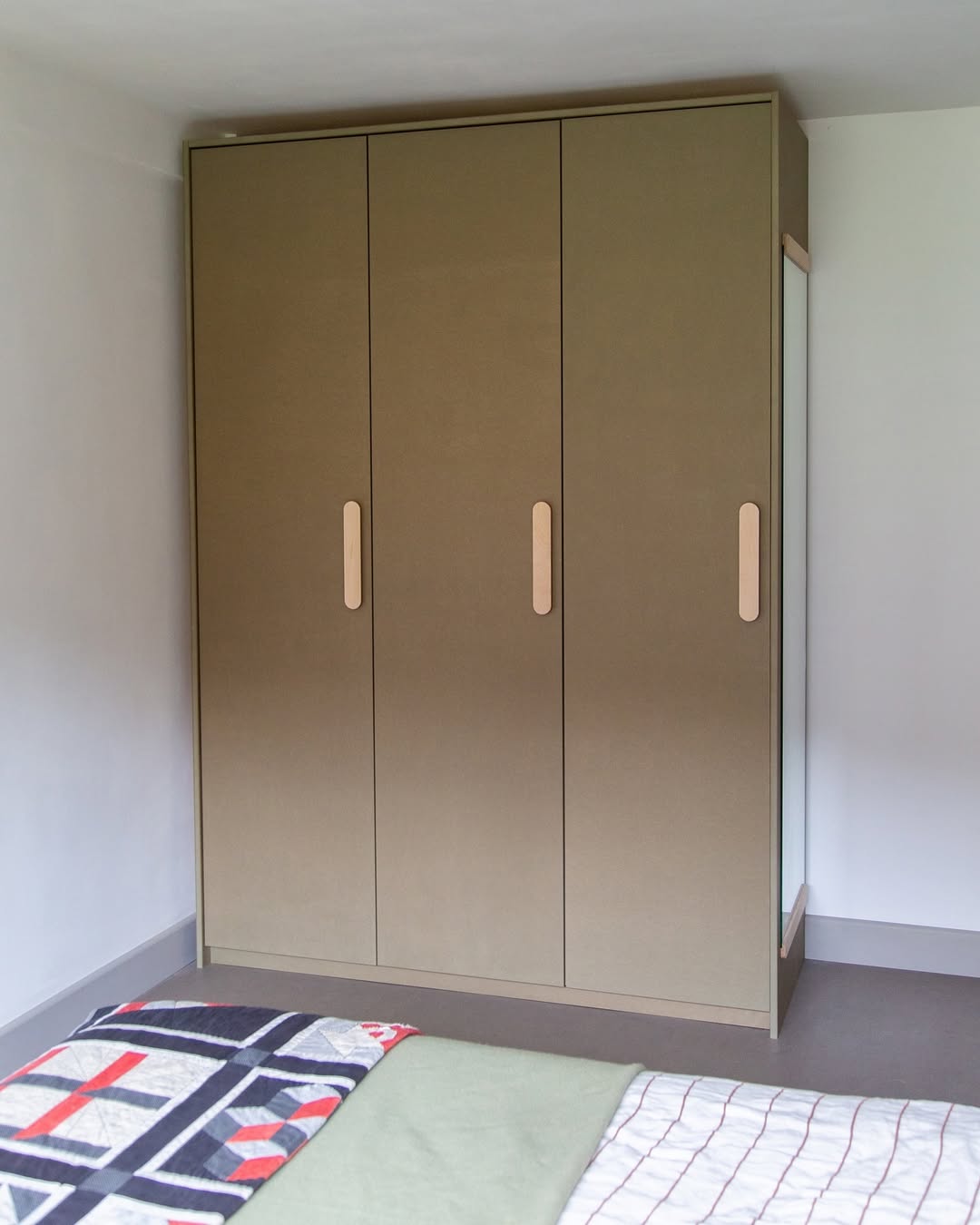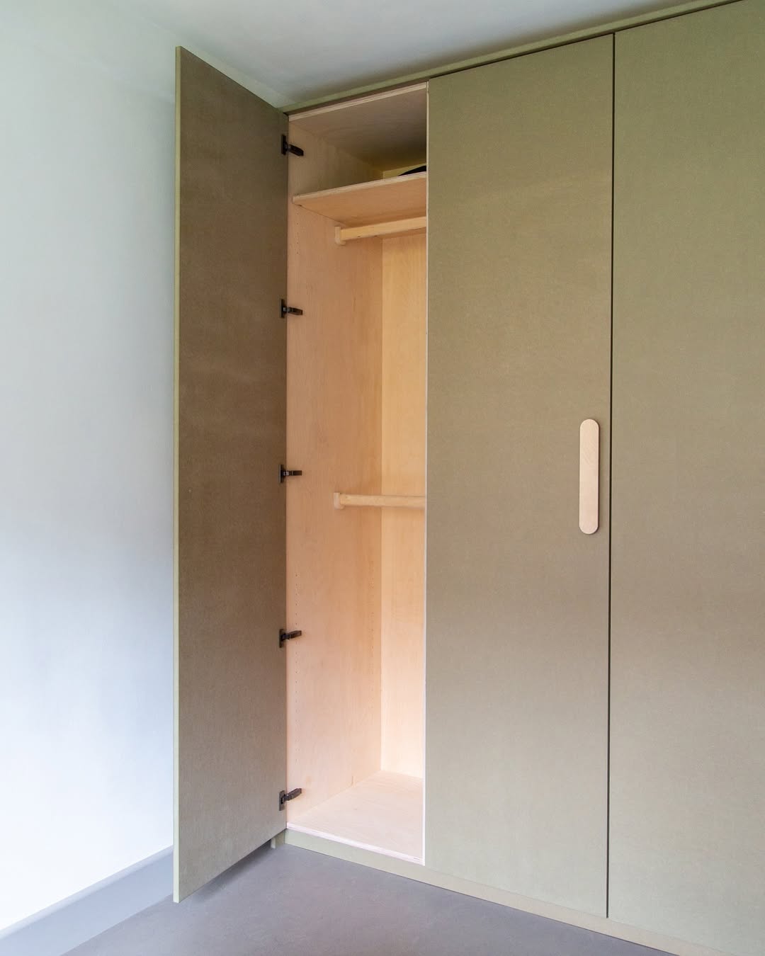 「這是一個今年大半時間都在清單上的居家專案,如今終於完成。選用卡其色沃克板,內部結構則為樺木夾板,整合吊掛、層板與抽屜收納配置。」